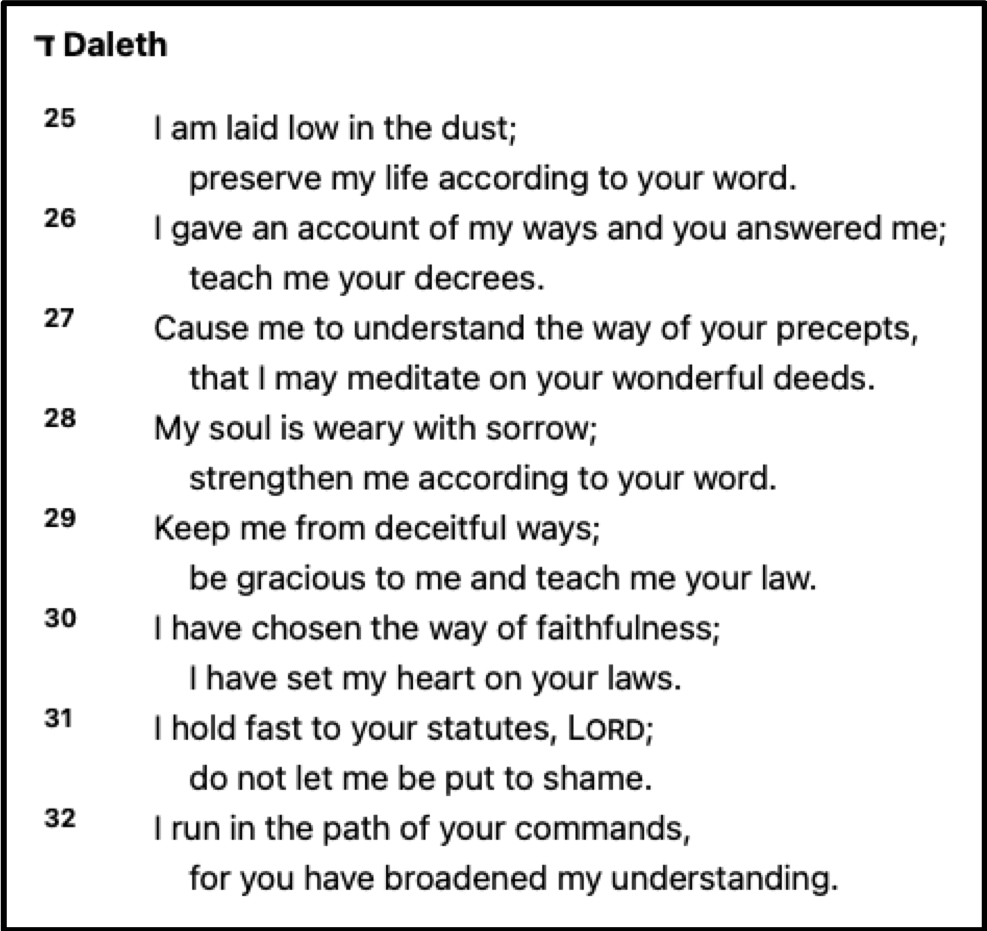 - Tanyaremkiv. Psalm 119:25-32 | Daleth. Accessed from https://tanyaremkiv.com/2020/07/27/psalm-11925-32-daleth/ on April 22, 2023.