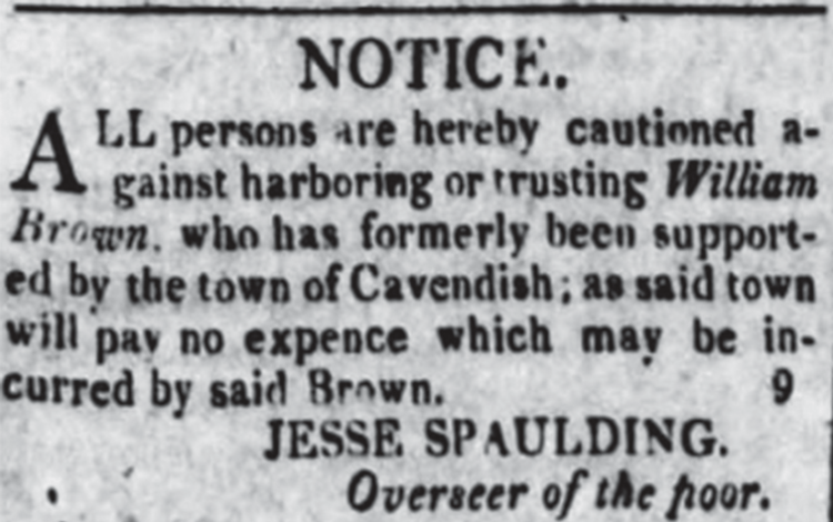 In addition to farming, Jesse helped enact Vermont’s legislation to provide for the needy by serving as Overseer of the Poor in the town of Cavendish in the early 1800s. It appears there was a system of accountability in place during that time as evidenced by the NOTICE regarding William Brown posted by Jesse Spaulding in the Vermont Republican newspaper on September 13, 1819.