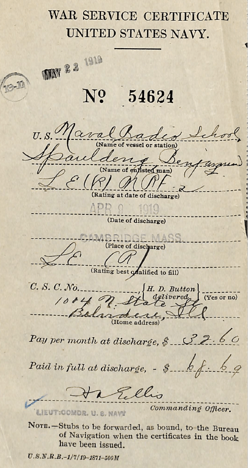 Apprentice Seaman Benjamin Spaulding was then transferred to the Ninth Naval District as a Naval Wireless Operator (Radioman) based out of Great Lakes, Illinois. Benjamin was discharged from the Naval Reserve Force on June 12, 1922, but he reenlisted three years later on January 26, 1925.