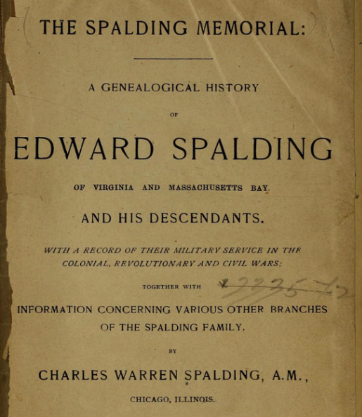 If you have Spalding/Spaulding ancestors and you’d like to add an outstanding reference to your family research library, you’ll want to get a copy of The Spalding Memorial, published by Charles Warren Spalding in 1897.